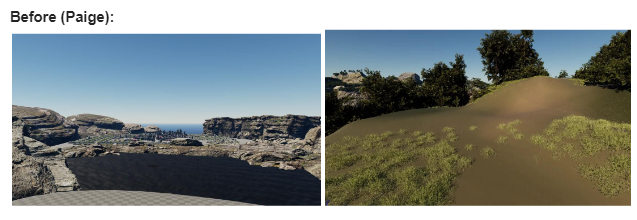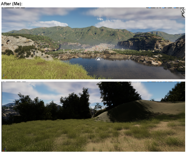 Once I imported the backgrounds, I polished off the overall scene. This included repainting the landscape material to repaint the hill, replacing the water material, adding the volumetric clouds, working exponential height fog to occlude the town slightly, foliage painting, and fiddling with the lighting / post process vol.